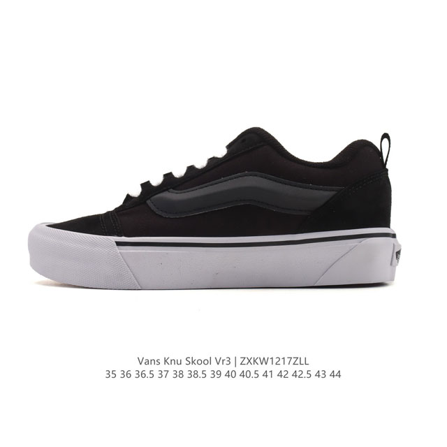 Vans Knu-Skool Vr3 Lx loafers with leather upper. The Campbell's Julian series low-top retro vulcanized casual sneakers with a "fat version and large logo" are definitely among the hottest shoe styles of the year, with almost every brand releasing its own version. Recently, Vans brought back the rarely seen Knu-Skool model, a collaboration with Imranpotato, and released four new colorways. The first colorway features a classic black and white design, with a more oversized and heavy silhouette that aligns with current trends. The upper is wrapped in leather, ensuring excellent texture, and paired with a white midsole, the overall look has a strong OG vibe. Sizes: 35-44 (including half sizes) Code: Zxkw1217Zll