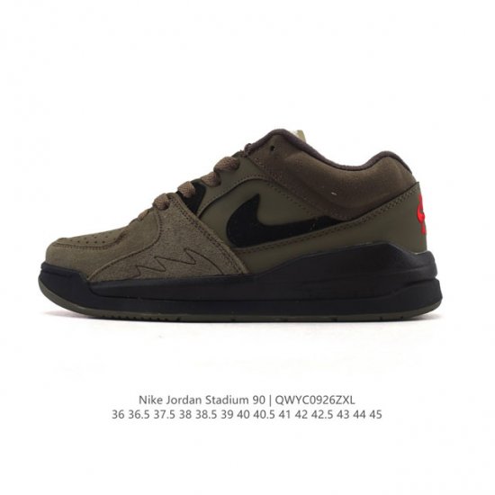 Authentic Nike Air Jordan Stadium Aj90 trendy sneakers, the Aj90 is full of homages to Tinkerhathield's original design, including a midfoot mesh panel, a shark tooth outline on the lateral forefoot, a padded collar, and an NK Air heel. The shoe itself is crafted from a blend of mesh, leather, and suede materials, exuding a modern aesthetic and equipped with the brand's new Formula 23 underfoot cushioning technology. The Airjordan Stadium 90 tongue label, with the word "Flight" printed on the inside of the tongue, completes the design.