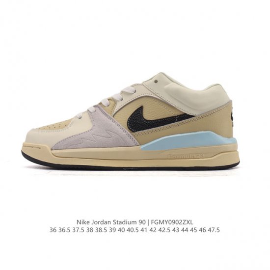 Authentic Nike Air Jordan Stadium Aj90 trendy sneakers, the Aj90 is full of homages to Tinkerhathield's original design, including a midfoot mesh panel, a shark tooth outline on the lateral forefoot, a padded collar, and an NK Air heel. The shoe itself is made of a mix of mesh, leather, and suede materials, exuding a modern aesthetic and equipped with the brand's new Formula 23 underfoot cushioning technology. The Airjordan Stadium 90 tongue label with the word "Flight" printed on the inside of the tongue completes the design.