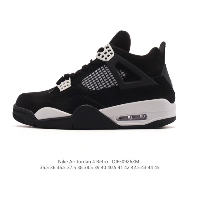 Corporate-grade, full-grain leather Nike Air Jordan 4 Retro Og Michael Jordan Aj4 generation Joe 4 low-top retro casual sports culture basketball shoes. Designed with the philosophy of lightweight speed basketball shoes in mind, reducing weight while improving comfort, the midsole continues the previous model's use of a split rear-foot visible Air Sole cushioning. The shoelace eyelets and heel tab are inspired by a basketball net, cleverly integrating basketball into the shoe's design, giving the overall shoe an overall fluidity, rhythmic feel, and elegance.