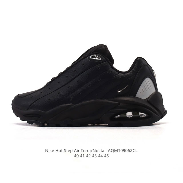 Nike Hot Step Air Terra Nocta Men's Air Cushioned Basketball Shoes. Small metal hook detail. Rapper Drake, his sub-brand Nocta, and Nike have collaborated on a new model featuring the Hot Step Air Terra. The shoe features a solid upper with metallic accents and a visible Air unit in the heel.
