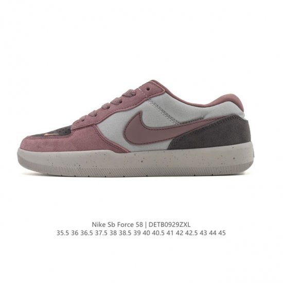Nike SB Force 58 Skateboarding Shoe. Bringing cutting-edge innovation to the streets, it features a vulcanized cupsole for exceptional durability and flexibility. With soft leather panels and vents throughout, it incorporates traditional basketball styling throughout, and this colorway reimagines the shoe.