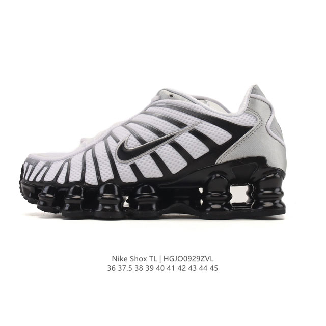 The Nike Shox TL men's and women's platform sneakers, a high-rise dad shoe, take mechanical cushioning to the next level. Featuring a breathable mesh upper and full-length Nike Shox technology, this reimagined 2003 classic delivers exceptional shock absorption and a striking street style. Nike Shox technology combines elastic, flexible shock-absorbing columns with a decelerating outsole design for enhanced compression and rebound cushioning. The composite upper and full-length TPU cage are nearly identical to the original 2003 Nike Shox TL design. A molded overlay wraps the midfoot for support and a comfortable fit. A TPU soleplate sits between the midsole and Nike Shox for lateral stability and support. A foam midsole provides lightweight cushioning, while a modified waffle outsole infused with non-marking hard rubber delivers both strong traction and exceptional durability.