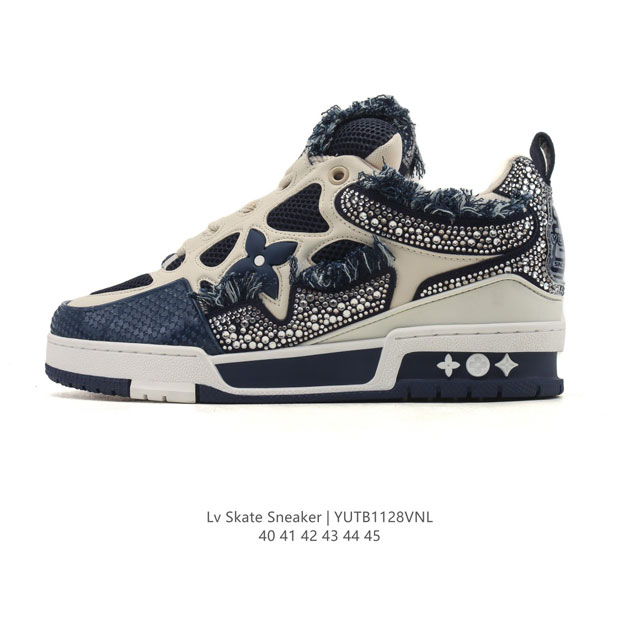 Louis Vuitton 2025 New Skate Sneaker, a limited edition for Spring/Summer 2025, debuted on the runway and is now presented in a refreshed version of grained calfskin leather. The padded collar and tongue draw inspiration from skateboarding shoe designs, while technical laces and a rubber outsole complete the look. The upper is made of grained calfskin leather, the outsole is rubber, and the tongue and heel of the sole are adorned with the Louis Vuitton logo. Sizes: 40-45 Code: Yutb1128Vnl