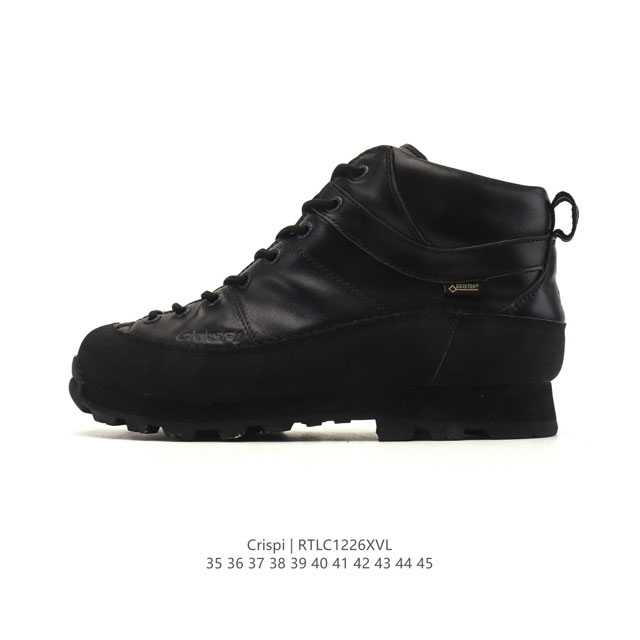 Crispi, a long-established Italian shoe manufacturer, presents their Awayhigh hiking boots, featuring a thick sole and platform. These high-top boots are ideal for outdoor hiking and trekking, requiring no break-in period. The widened insole, asymmetrical design, and Eva midsole address issues like foot constriction and toe pressure, while providing excellent comfort and durability. The outsole pattern and materials are suitable for various terrains, including grass, post-rain grass, mud, and gravel, ensuring stable grip. The insole contains an activated carbon layer for deodorization and moisture control. While priced higher, the shoes offer superior aesthetics and performance, representing a high-quality, handcrafted product from Italy. Sizes: 35-45 Code: Rtlc1226Xvl