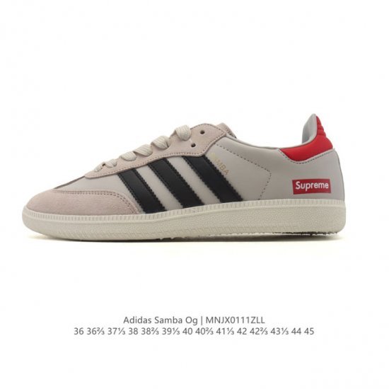 Adidas Originals Samba Og Shoes - Classic white sneakers, T-toe shoes for men and women, showcasing a casual and modern style. Born on the football field in the 1950s, it later spread to the streets and runways. The Adidas Samba stands out as a fashion icon. This classic Samba Og shoe features a leather upper and rubber outsole for comfort and casual wear. It pays homage to the Samba's traditional design with its serrated three stripes and distinctive T-toe. Subtle gold foil details add a touch of style. Staying true to its roots, its passion never fades. Regular fit, lace-up design, leather upper, fabric lining, rubber outsole. Type: Men's and Women's Shoes Product Code: Jq5976 Sizes: 36-45 (including half sizes) Code: Mnjx0111Zll