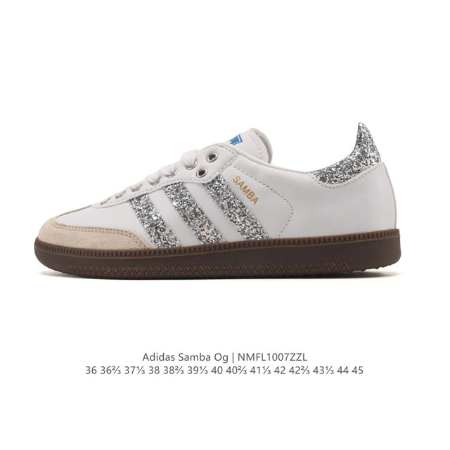 Adidas Originals Samba Og Shoes, classic white sneakers, T-toe shoes for men and women, showcasing a casual and modern style. Born on the football field in the 1950s, it later spread to the streets and runways. The Adidas Samba stands out as a fashion icon. This classic Samba Og shoe features a breathable leather upper and a rubber outsole for comfort and casual wear. It pays homage to the Samba's traditional design with its serrated three stripes and distinctive T-toe. Subtle gold foil details add a touch of style. Staying true to its roots, the passion never fades. Regular fit, lace-up design, leather upper, fabric lining, rubber outsole. Product Code: Ig1025 Sizes: 36-45 (including half sizes) Code: Nmfl 7Zzl