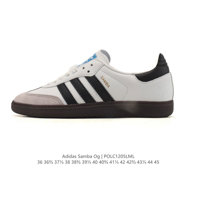 Adidas Originals Samba Og Shoes, classic white sneakers, T-toe shoes for men and women, showcasing a casual and modern style. Born on the football field in the 1950s, it later spread to the streets and runways. The Adidas Samba stands out as a fashion icon. This classic Samba Og shoe features a soft leather upper and a rubber outsole for comfort and casual wear. It pays homage to the Samba's traditional design with its serrated three stripes and distinctive T-toe. Subtle gold foil details add a touch of style. Staying true to its roots, its passion never fades. Regular fit, lace-up design, leather upper, fabric lining, rubber outsole. Product Code: Ki8887 Sizes: 36-45 (including half sizes) Code: plc1205Lml