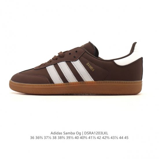 Adidas Originals Samba Og Shoes, classic white sneakers, T-toe shoes for men and women, showcasing a casual and modern style. Born on the football field in the 1950s, it later spread to the streets and runways. The Adidas Samba stands out as a fashion icon. This classic Samba Og shoe features a soft leather upper and a rubber outsole for comfort and casual wear. It pays homage to the Samba's traditional design with its serrated three stripes and distinctive T-toe. Subtle gold foil details add a touch of style. Staying true to its roots, the passion never fades. Regular fit, lace-up design, leather upper, fabric lining, rubber outsole. Product Code: Ki8887 Sizes: 36-45 (including half sizes) Code: Dsra 3Lkl