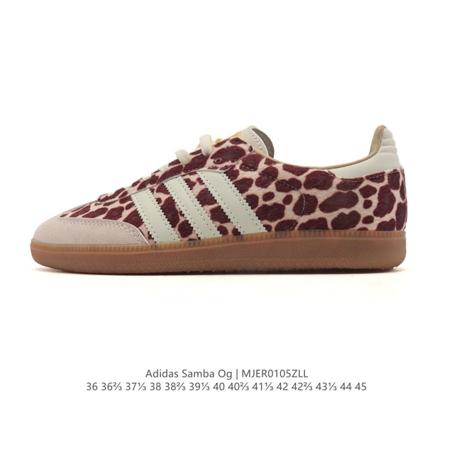 Adidas Originals Samba Og Shoes, Leopard Print Classic Sneakers, White Sneakers, T-Toe Shoes for Men and Women, a fashionable classic shoe showcasing a casual and modern style. Born on the football field in the 1950s, it later spread to the streets and runways. The Adidas Samba stands out as a fashion icon. This classic Samba Og shoe features a leather upper and rubber outsole for comfort and casual wear. It pays homage to the Samba's traditional design with its serrated three stripes and distinctive T-toe. Subtle gold foil details add a touch of style. Staying true to its roots, the passion never fades. Regular fit, lace-up design, leather upper, fabric lining, rubber outsole. Type: Men's and Women's Shoes Product Code: Jq5976 Sizes: 36-45 (including half sizes) Code: Mjer0105Zll