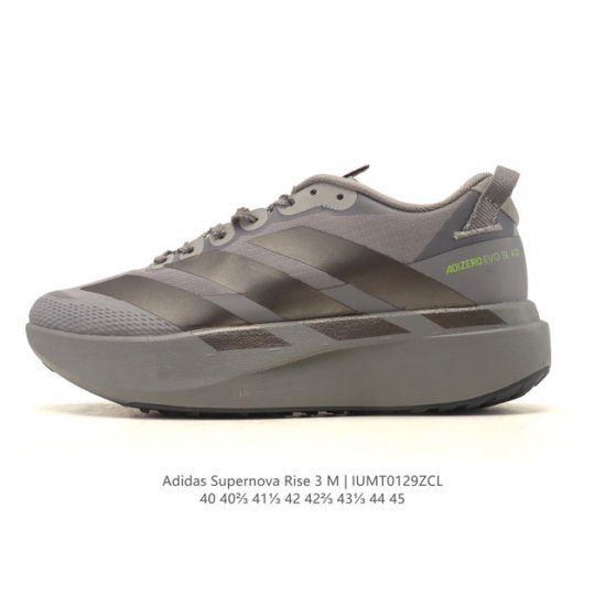 Adidas Supernova Rise 3 Shoes - Slip-resistant, durable, and comfortable running shoes. Midsole technology: Utilizes Dreamstrike+ supercritical foam material reconstructed from Peba base material, combining cushioning and rebound. Support system: Density gradient support bar design optimizes gait transition stability. Waterproof version: GTX model features a Gore-Tex invisible waterproof membrane, suitable for rainy conditions. Last design: Standard width last with comfortable heel lockdown; some users have reported that the lacing system of the regular version needs improvement in terms of fit. Suitable scenarios: Optimal cushioning for 5-minute pace jogging; forefoot slippage occurs below 4.5-minute pace. Durability: Continental rubber outsole demonstrates good durability in multi-terrain testing. Type: Men's shoes. Product code: Jr9607. Sizes: 40-45 (including half sizes). Code: Iumt0129Zcl.