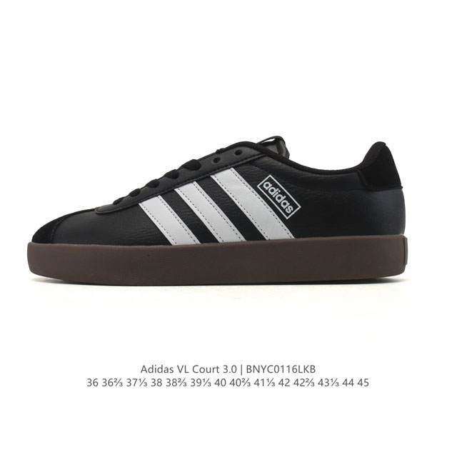 Adidas Vl Court 3.0 Shoes, Tennis, Casual Skate Shoes, T-Toe Shoes. This classic Adidas sneaker combines casual style with sophistication, making it versatile and stylish. The leather upper features the iconic three stripes with colorful outlining for a striking look. It has a vulcanized rubber outsole inspired by skate parks. The inner layer has a unique design and includes a comfortable lining. Features include a regular fit, lace-up design, leather upper, fabric lining, comfortable midsole, and vulcanized rubber outsole. Type: Men's/Women's Shoes Product Code: Id8797 Sizes: 36 36 37 38 38 39 40 40 41 42 42 43 44 45 Code: Bnyc0116Lkb