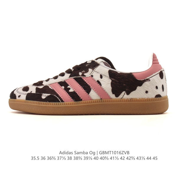 Company-grade Adidas Originals Samba Og Shoes, classic white sneakers, T-toe shoes, cow-spot plush fabric upper, men's and women's sneakers, showcasing a casual and modern style. Born on the football field in the 1950s, it later spread to the streets and runways. The Adidas Samba stands out as a fashion icon. This classic Samba Og shoe features a soft fabric upper and rubber outsole for comfort and casual wear. It pays homage to the Samba's traditional design with its serrated three stripes and distinctive T-toe. Subtle gold foil details add a touch of style. Staying true to its roots, the passion never fades. Regular fit, lace-up design, fabric upper, fabric lining, rubber outsole. Product Code: Jr0035 Sizes: 35.5-45 (including half sizes) Code: Gbmt1016Zvb