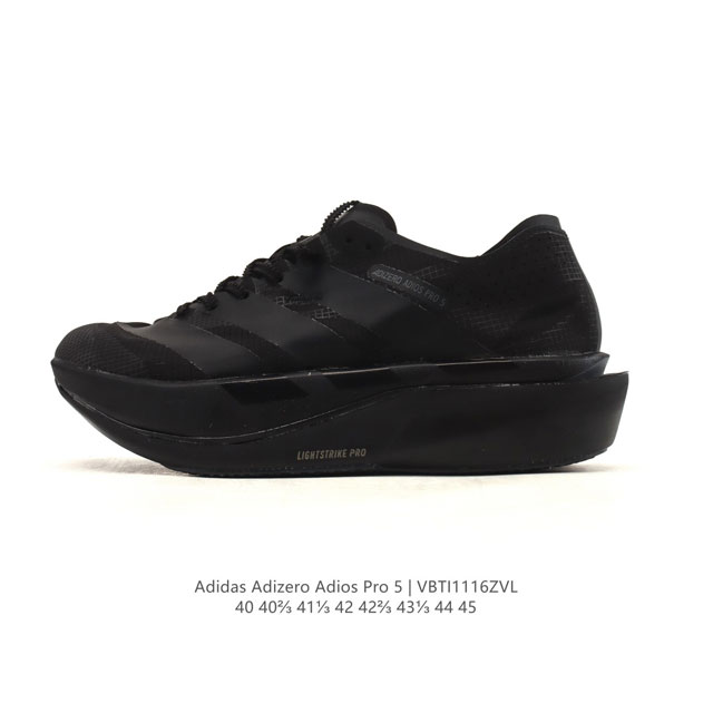 New Product: Adidas Adizeroadios Pro 5 Ultralight Marathon Carbon Column Professional Racing Shoes (Company Grade). The Adidas Adizero Adios Pro 5 is Adidas' professional marathon racing shoe, the latest product in the Adizero series. According to currently available information, the Pro 5 features significant upgrades over its predecessor, employing a dual propulsion system design with a carbon column and carbon plate. Reports also suggest the use of a ring-shaped carbon plate, resulting in substantial changes in style and performance, aiming to provide runners with enhanced energy return and propulsion, boosting racing performance. Product Code: Jr1671 Sizes: 40-45 (including half sizes) Code: Vbti1116Zvl