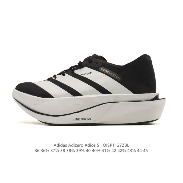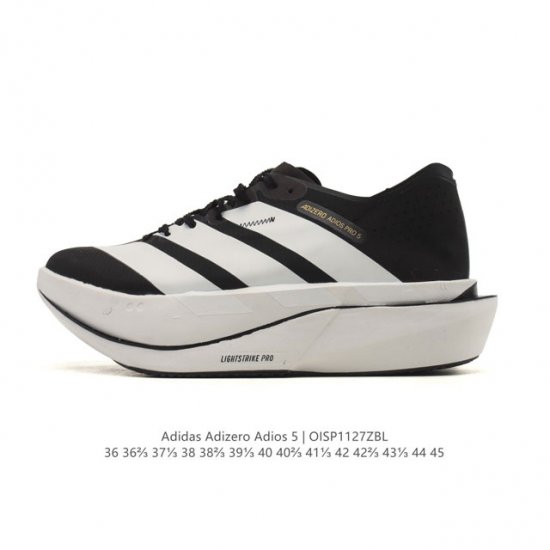 New Product: Adidas Adizeroadios Pro 5 Ultralight Marathon Carbon Column Professional Racing Shoes (Company Grade). The Adidas Adizero Adios Pro 5 is Adidas' professional marathon racing shoe, the latest product in the Adizero series. According to currently available information, the Pro 5 features significant upgrades over its predecessor, employing a dual propulsion system design with a carbon column and carbon plate. Reports also suggest the use of a ring-shaped carbon plate, resulting in substantial changes in style and performance, aiming to provide runners with stronger energy return and propulsion, enhancing racing performance. Product Code: K18293 Sizes: 36-45 (including half sizes) Code: Ois Zbl