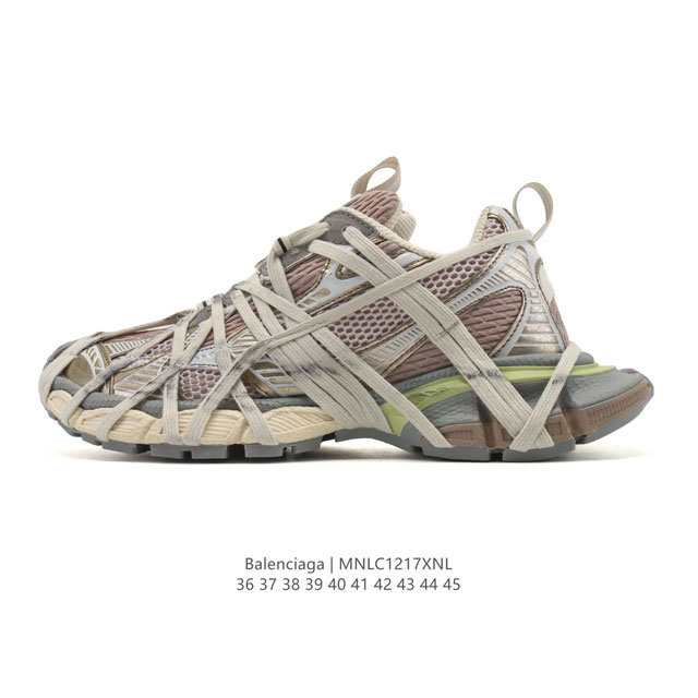Company Grade Balenciaga 3XL Sneakers. Balenciaga 10th Generation Mesh Lace-up Low-Top Runway Retro Dad Sneakers. Deconstructed lace-up breathable mesh upper and polyurethane distressed effect. Balenciaga logo on the toe and heel. Embossed size on the upper and heel. 3XL rubber branding and reflective details on the tongue. Reflective details on the collar and tongue pull tabs. Spare laces are located on the front of the shoe and can be removed before wearing for different styling options. True to size. Sizes: 36-45. Code: Mnlc1217Xnl.