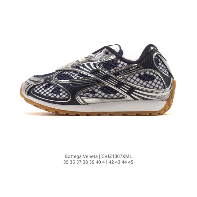 Company Grade Bottega Veneta 2025 Spring/Summer Collection Men's and Women's Orbit Sneakers. Bottega Veneta is an Italian luxury brand, using traditional leather and fabric splicing techniques. These Runner sneakers feature a lightweight technical canvas upper and a geometric patterned rubber outsole. Technical fabric lace-up design. Lining: Technical fabric. Rubber outsole. Suggested size: Run one size large. Made in Italy. Sizes: 36-45. Code: Cvjz1007Xml.