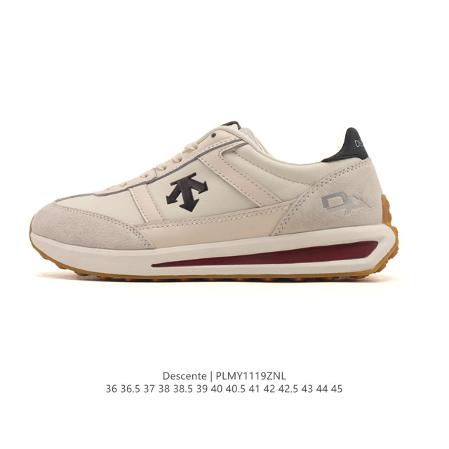 New Product: Descente Cron Racer Casual Sneakers, unisex design. The Descente Cron Racer series is a multi-scenario casual shoe that blends minimalist Japanese design with functional technology. Key features include: 1. Core Functions and Technology: All-weather anti-slip outsole: Suitable for urban commuting, rainy days, etc. EVA cushioning layer + TPU anti-torsion plate: Reduces foot fatigue after light exercise such as cycling and camping. Easy-care materials: A combination of cowhide and suede upper for easy cleaning, stain-resistant design, and antibacterial insole, suitable for students, mothers, and other frequent users. 2. Design Style and Styling: Japanese retro running shoe style: Matte leather and suede materials highlight the City Boy style. Slim summer design: Fabric-like construction without sponge padding, suitable for hot weather. Suitable for: Light outdoor hiking, urban sports. The sole pattern design enhances terrain adaptability. Simple yet versatile, it's easy to wear for commuting or sports. A must-have in your wardrobe! The streamlined design of this white sneaker is flattering and slimming, matching any outfit effortlessly for a stylish look! Product Code: D3432Lcr23-Bk-1 Sizes: 36-45 (including half sizes) Code: plmy1119Znl