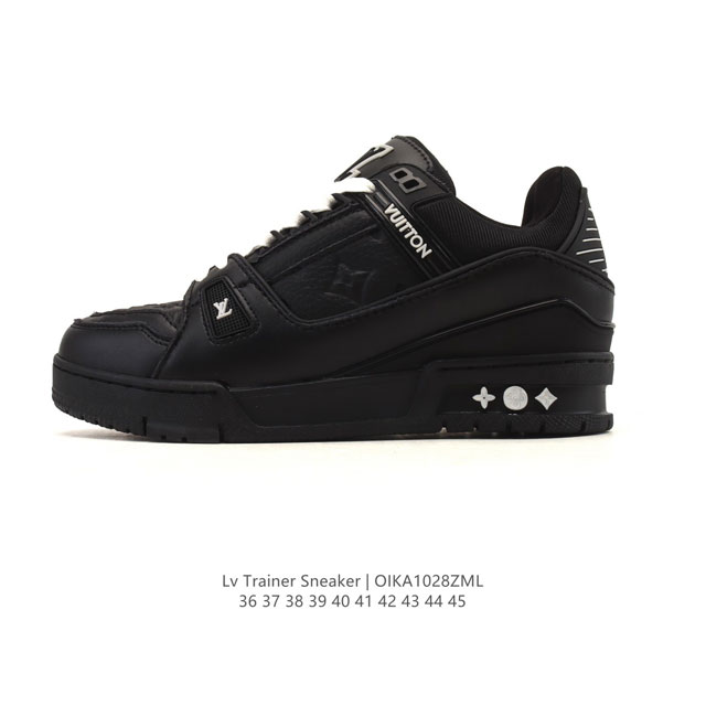 Company-grade top-grain leather strap chip Louis Vuitton Lv Louis Vuitton sneakers, fashionable sports shoes, trendy thick-soled height-increasing men's and women's shoes. Comfortable and non-slip sole and versatile, dominating the entire fashion and entertainment industry. Perfectionist details! Features a soft leather upper, an exclusive molded outsole, and a 3D-printed iconic logo on the side, exuding a noble and fashionable aura. Comes with authentic packaging. New Louis Vuitton Trainer Sneaker Low casual sports culture versatile sneakers. Type: Men's and women's shoes. Size: 36-45. Code: Oika1028Zml
