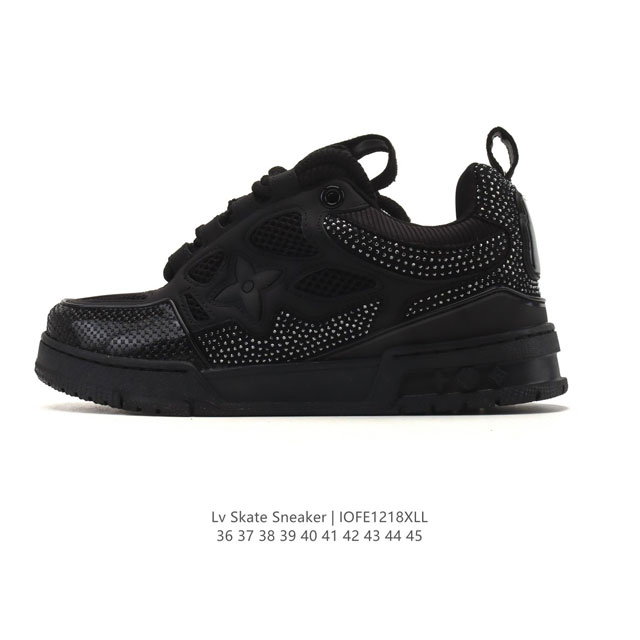 Louis Vuitton 2025 New Skate Sneaker, a limited edition Spring/Summer sneaker for the Year of the Snake, debuted on the runway and is now presented in a refreshed version of grained calfskin leather. The padded collar and tongue draw inspiration from skateboarding shoe designs, while technical laces and a rubber outsole complete the look. The upper is made of grained calfskin leather, the outsole is rubber, and the tongue and heel of the sole are adorned with the Louis Vuitton logo. Sizes: 36-45 Code: Iofe1218