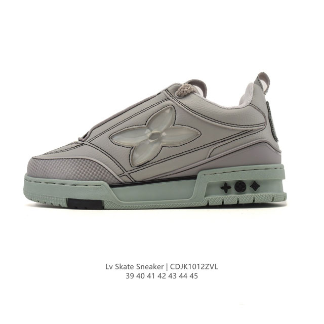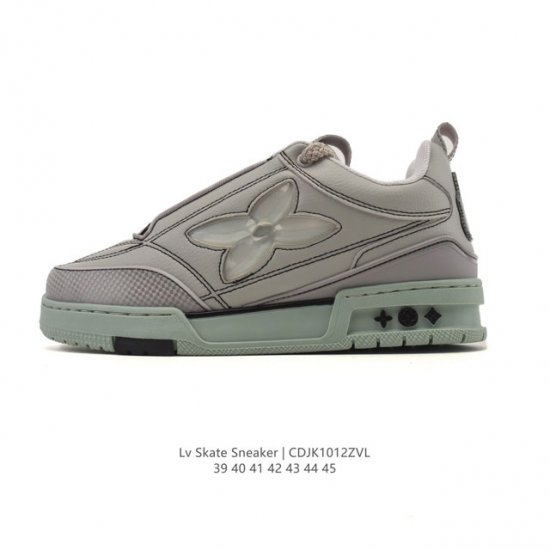 Louis Vuitton 2025 New Skate Sneaker, a limited edition Spring/Summer sneaker for the Year of the Snake, debuted on the runway and is now presented in a refreshed version of grained cowhide leather. The padded collar and tongue draw inspiration from skateboarding shoe designs, while technical laces and a rubber outsole complete the look. The upper features a combination of grained cowhide leather and mesh, a rubber outsole, and Louis Vuitton logos on the tongue and heel. Sizes: 39-45 Code: Cdjk1012Zvl