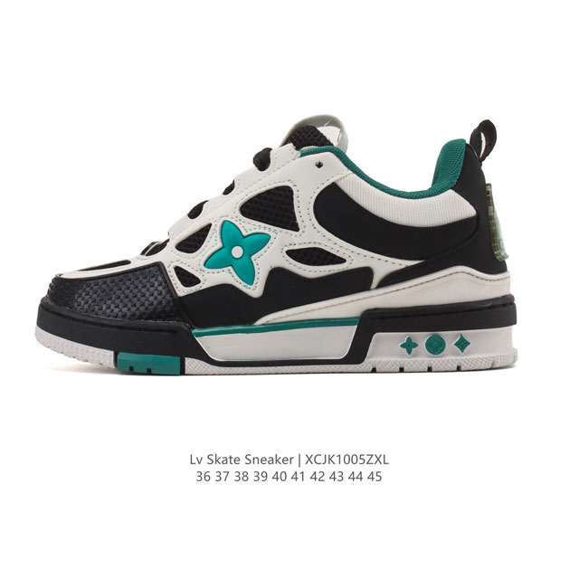 Louis Vuitton 2025 Skate Sneaker, a limited-edition Spring/Summer sneaker for the Year of the Snake, debuted on the runway and is now presented in a refreshed version of grained calfskin leather. The padded collar and tongue draw inspiration from skateboarding shoes, while technical laces and a rubber outsole complete the look. The upper features a combination of grained calfskin leather and mesh, a rubber outsole, and Lv logos on the tongue and heel. Sizes: 36-45 Code: Xcjk 5
