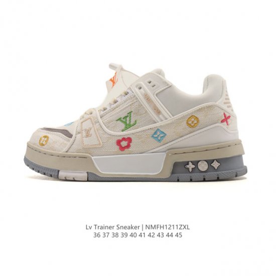 Louis Vuitton Lv Louis Vuitton Trainer Sneaker Low, a stylish and trendy men's sneaker with a platform sole and added height. Comfortable, non-slip sole and versatile design dominate the fashion and entertainment industry. Perfected details! Features a soft leather upper, an exclusive molded outsole, and a 3D-printed iconic logo on the side, exuding aristocratic style. Comes with authentic packaging. New Louis Vuitton Trainer Sneaker Low, a casual and sporty versatile sneaker. Type: Men's Shoes Sizes: 36-45 Code: Nmfh1211