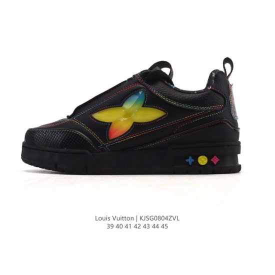Lv Skate Sneaker, Louis Vuitton's new 2025 sneaker, debuted at the Spring/Summer 2025 runway show for the Year of the Snake, now presented in a new look in grained calfskin leather. The padded collar and tongue reference skateboarding, while technical laces and a rubber outsole complete the look. The upper features a grained calfskin and mesh paneling, a rubber outsole, and LV logos on the tongue and back of the sole.