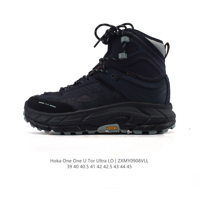 Hoka One One Tor Ultra High, a stylish, comfortable, non-slip, wear-resistant, waterproof, and wrap-around high-top outdoor performance shoe. The upper features a comfortable fabric for a comfortable fit. The curved outsole design provides smooth landings and acceleration. The outsole shape enhances mobility. Made of lightweight, original Fresh Foam materials, the ultra-lightweight midsole is fully 3C-certified. Rolling Balance technology reduces energy consumption by 33%.