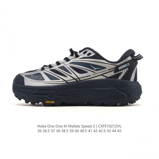 Company-grade Hoka One One Mafate Speed 2 Low lightweight low-top outdoor trail running shoe. The upper features a lightweight, seamless construction, with wide, elastic laces that are durable and won't easily come undone. Thin TPU padding is applied to the breathable upper. The design is inspired by the Alps, with bright colors and blue tones covering the silhouette. The forefoot and midfoot are widened, and the rubber outsole features EVA cushioning and Roll Balance technology to guide the runner's natural gait. Sizes: 36-45 (including half sizes). Code: Cxfe1021Zvl