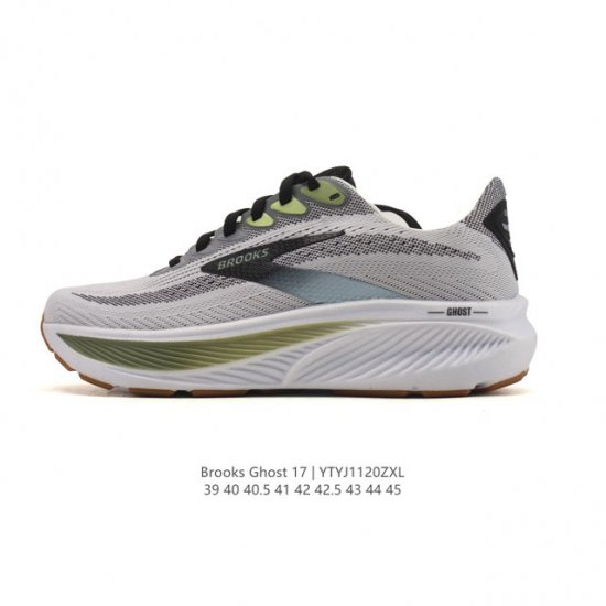 New Product: Brooks Ghost 17, a classic platform chunky sneaker with a Max cushioning system. Features a Dna Loft V3 nitrogen-infused supercritical foam midsole, 26mm thick in the forefoot and 36mm in the heel, with a 10mm incline design for a balanced softness and bounce. Nitrogen injection creates a closed-loop airbag structure, improving cushioning by 30% and energy return efficiency by 10% compared to its predecessor. Real-world testing shows that it absorbs 68% of the impact force on an 80kg runner's heel strike, and the forefoot rebound speed is increased by 15%. It uses a double-layer jacquard engineered mesh; the outer high-density breathable mesh wicks away sweat quickly, while the inner elastic support frame enhances the fit. The 5mm wider forefoot last design, combined with a thicker memory foam tongue, allows even runners with wider feet to achieve a zero-break-in fit. The 3D molded foam in the heel and the TPU stabilizer form a dual-locking structure, ensuring reliable stability under complex terrain. Suitable for a 5:30-6:30 km jogging pace, balancing cushioning and propulsion. The outsole contains 30% recycled polyester fiber, and the upper uses bio-based materials. Available in standard and wide last versions to accommodate different foot shapes. Emphasizing "all-around cushioning," it's suitable for daily training and long-distance jogging. Type: Men's Shoes; Product Code: 110442; Sizes: 39-45 (including half sizes); Code: Ytyj1120