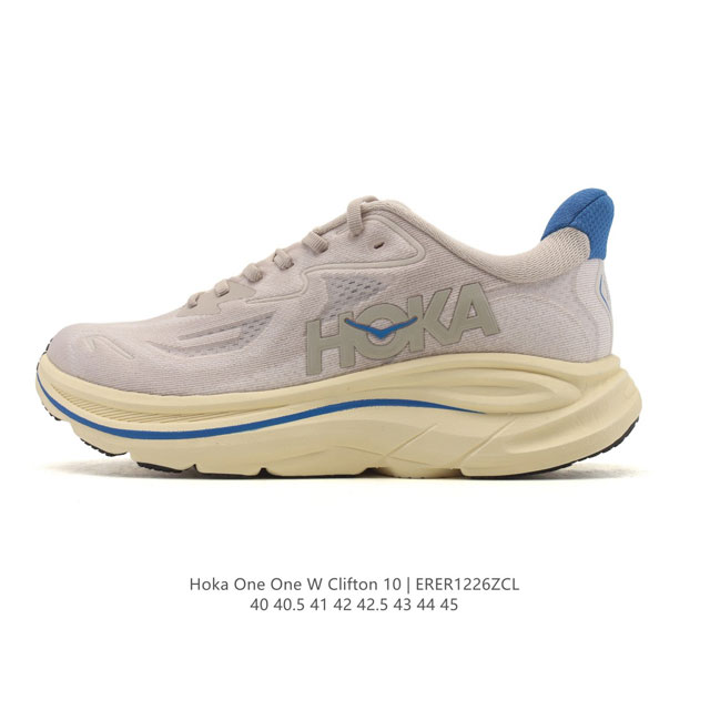 The new Hoka One One releases the upgraded Clifton 10, a lightweight, cushioned casual running shoe for men and women. The Hoka One One Clifton series is their best-selling road running shoe. The Clifton Edge, launched in 2020, features a one-piece woven upper with a multi-hole pattern design, using different densities of fabric in different areas, giving it a thicker appearance while providing good breathability. The forefoot uses an embossed TPU patch to enhance the upper's coverage and provide stronger protection and support. The iconic Hoka logo on the heel adds to the shoe's visual appeal. The midsole uses a new high-resilience foam, and the two-tone outsole also uses a thick layer of rubber EVA foam, offering high responsiveness while maintaining cushioning and lightweight design. The outsole features a wide design typical of road running shoes, with dense treads of varying depths in the forefoot and heel for both stability and traction. This shoe boasts a retro and exaggerated look, is incredibly lightweight, and is a great choice for everyday wear. Sizes: 36-45 (including half sizes) Code: Erer1226Zcl