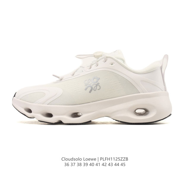 New Loewe x On Running Collaboration Sneakers. The Loewe x On Running collaboration autumn/winter new style Cloudsolo running shoes feature a classic, luxurious look. These round-toe, drawstring, low-top casual shoes are perfect for everyday wear. The Cloudsolo is a collaboration between luxury brand Loewe and Swiss sportswear brand On Running. The design blends Loewe's Spanish leather craftsmanship with On Running's Swiss ergonomics. The upper uses a semi-transparent mesh material paired with the iconic pebble buckle. Cushioning technology includes a single Cloudtec cushioning module in the heel, and the midsole uses Helion super-elastic foam + Speedboard support structure, balancing lightweight design with responsiveness. Sizes: 36-45. Code: plfh1125Zzb