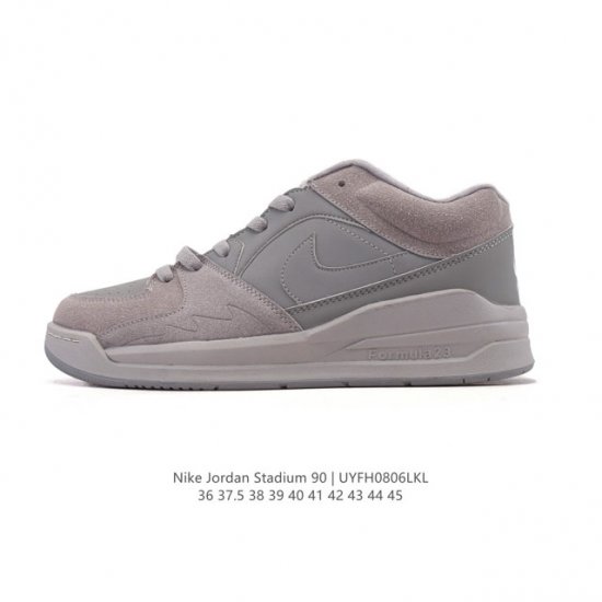 Authentic Nike Air Jordan Stadium Aj90 trendy sneakers. The Aj90 is full of nods to Tinkerhathield's original design, including a midfoot mesh panel, a shark tooth outline on the lateral forefoot, a padded collar, and an NK Air heel branding. The shoe itself is constructed from a blend of mesh, leather, and suede materials, exuding a modern aesthetic and equipped with the brand's new Formula 23 underfoot cushioning technology. The Airjordan Stadium 90 tongue label with "Flight" printed on the inside of the tongue completes the design.