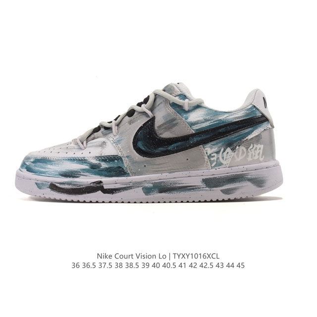 Company Grade Nike Court Vision Low Campus Style Low-Top Retro Basketball Shoes Deconstructed Lace-up Double Lace. Continuing the retro basketball shoe style of the 80s, adding collegiate details. Leather and combination upper, clean style, recreating the retro basketball look. Perforated toe and sides for ventilation, rubber outsole for grip, structural support and fit combined with retro basketball details. Drawing inspiration from mid-1980s basketball shoe design, thick laces, original round pivot point on the sole, retro Swoosh design, vulcanized construction cleverly integrates the outsole and midsole, leather and synthetic material combination upper, stitched Swoosh design, ventilation design on the toe and sides, and an embossed "Nike" on the heel. Product Code: Dh2987 Sizes: 36-45 (including half sizes) Code: Tyxy1016Xcl