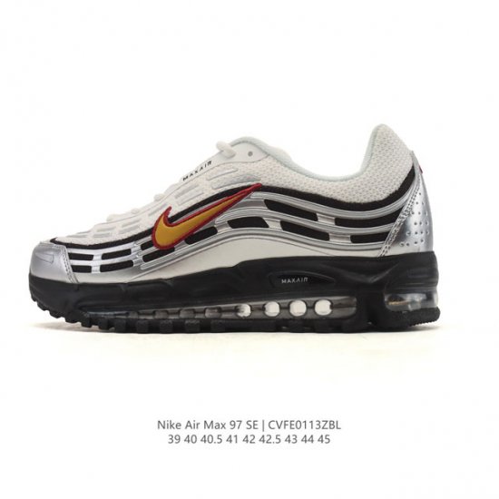 Nike Air Max 97 Se Men's Running Shoes with Cushioning, Thick Sole, Height Increase, and Versatile Performance. Constructed from a combination of fabric and leather, the stitching on the sides features a deconstructed design, with the layering of different materials enhancing the original overlapping lines and creating a distinct sense of depth. Additionally, the extra-large, extra-thick Air unit provides a visually striking impact and a significant height increase. Product Code: Im6647 Sizes: 39-45 (including half sizes) Code: Cvfe0113Zbl