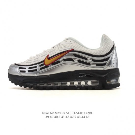 Nike Air Max 97 Se Men's Running Shoes with Cushioning, Thick Sole, Height Increase, and Versatile Performance. Constructed from a combination of fabric and leather, the stitching on the sides features a deconstructed design, with the layering of different materials enhancing the original overlapping lines and creating a distinct sense of depth. Additionally, the extra-large, extra-thick Air unit provides a visually striking impact and a significant height increase. Product Code: Im6647 Sizes: 39-45 (including half sizes) Code: Tgsg0117Zbl