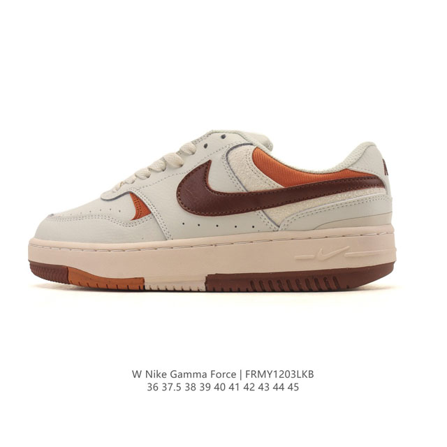 Nike Gamma Force Anti-slip, Shock-absorbing, Durable Low-top Retro Sneakers/Casual Sneakers. The Nike Gamma Force sneakers feature a layered design, mixing natural leather and synthetic materials to refresh the classic AF1 silhouette, doubling comfort and style, accumulating power for a transformation. The Nike Grind outsole combined with a glossy plastic heel clip adds a fashionable touch, creating a unique classic for the Gamma Force. The combination of leather and synthetic materials provides excellent durability and a three-dimensional feel, brightening different looks. The cleverly designed platform sole provides a height boost, and the Nike Grind rubber elements feature a speckled texture. Type: Men's/Women's Shoes Product Code: Fq2766-100 Sizes: 36 37.5 38 39 40 41 42 43 44 45 Code: Frmy 3Lkb