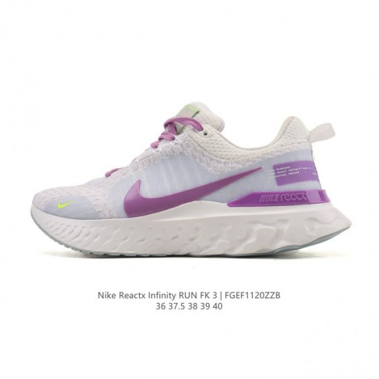 Nike React Infinity Run Fk 3 prm Road Running Shoes. Helping you recover quickly after a fast run, so you can continue your endurance challenge tomorrow, with it providing solid support throughout your journey. A wider forefoot design and thicker foam layer enhance soft cushioning for a comfortable and smooth run. This time-tested shoe boasts excellent rebound performance, incorporating a swift and stylish design to help you run fast and smoothly, moving forward all the way. Inspired by pacers who lead others to their goals, this shoe presents a dazzling and vibrant take on a running essential. Nike React technology is crafted from lightweight and durable foam, creating a smooth and responsive stride. The foam features an "arc rocker" design, providing excellent support for all three phases of the running motion. The Flyknit upper provides excellent breathability in key areas. A raised cushioning design in the sole, added rubber material in the outsole, and a soft foam fabric collar complement the Flyknit perfectly. Type: Women's Shoes Item Number: Fj7068-120 Sizes: 36-40 Code: Fgef1120Zzb