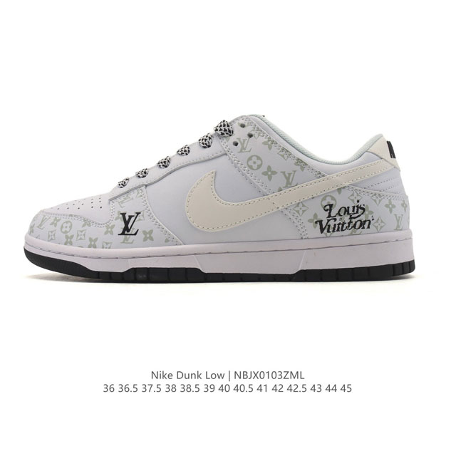 This Nike Dunk Low Retro sneaker is a Louis Vuitton collaboration, a classic basketball shoe from the 80s. Originally designed for hardwood courts, it later became a street style icon, and now returns with classic details and a retro basketball aesthetic. The upper combines leather and synthetic materials for durability and exceptional softness. A foam midsole provides lightweight and responsive cushioning, while the rubber outsole with circular pivot points offers exceptional traction, showcasing its classic style. From backboards to skateboards, the influence of the Nike Dunk is undeniable. Although it debuted as a basketball shoe in 1985, its flat and grippy sole captured the attention of skateboarders, making it an ideal choice for skateboarding. For decades, the Dunk has resonated with skateboarders worldwide, releasing countless colorways, pursuing a balance of creativity and functionality, and showcasing the vibrancy of subcultures. DDD Type: Men's and Women's Shoes DDD Item Number: Cs1688 DDD Size: 36-45 (including half sizes) DDD Code: Nbjx0103Zml DDD