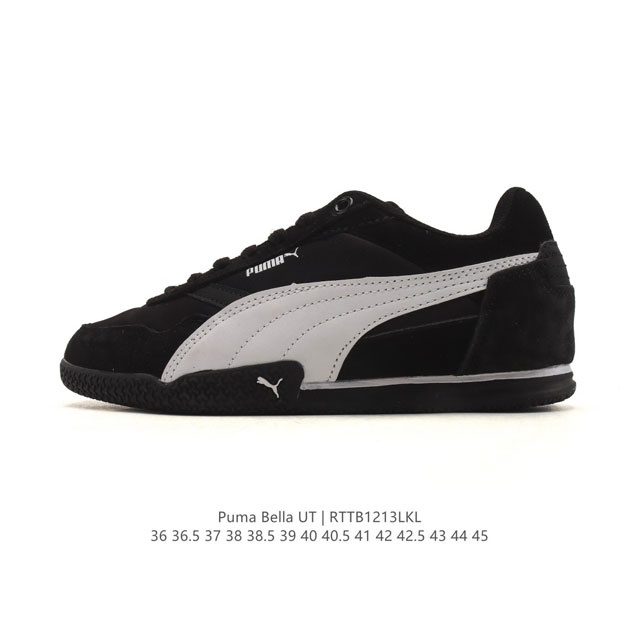 Puma Bella Ut - Stylish, Versatile, Comfortable, Non-Slip Low-Top Casual Shoe with a Thin Sole. Following the return of the Speedcat Og, Puma has once again used the classic Bella Og silhouette from its archives as a base to launch the Bella Ut, a shoe that fits the current trend of thin-soled sneakers. The upper is made of premium leather and continues the Formstrip design language; the toe box features a closed-toe design with suede material for enhanced texture; the sole retains the Bella's signature thin sole and dotted rubber outsole, with an upturned design that wraps around the upper; the tongue and heel are adorned with the cougar logo and the brand's initials, respectively. This shoe features a Softfoam+ insole, balancing aesthetic design with wearing comfort. Available in five colors: white, yellow, blue, silver, and pink. DDD Product Code: 404709 04 DDD Sizes: 36-45 (including half sizes) DDD Code: Rttb1213Lkl DDD