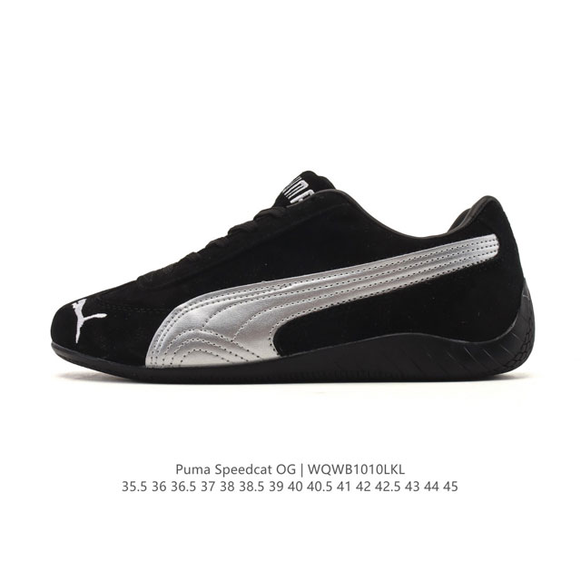 Puma Speedcat Og is a low-top, retro-inspired, versatile casual racing shoe from the Puma Speedcat series. Inspired by the fire-resistant racing shoes worn by race car drivers in the 80s and 90s, the shoe's lines mimic the streamlined silhouette of a race car, embodying aerodynamic principles. The simple and sleek appearance blends perfectly with the Formstrip logo, creating a visually rich and harmonious design. The biggest highlight of this Speedcat Og release is the retention of its narrow silhouette and thin sole. While other brands have been making their soles thicker in recent years, Speedcat goes against the grain, offering a refreshing visual experience with an almost sole-less effect. The upper is still made of high-quality, breathable, and soft leather, with extensive use of almost full coverage, further enhancing its retro feel. The colorway brings back the original black and red, paying homage to the iconic F1 racing team uniforms. The striking bright red is sure to catch everyone's eye at first glance, instantly brightening up any outfit and making it stand out in Ootd's sneaker-centric market. The black version, on the other hand, is a low-key all-rounder, showcasing a trendy personality without being overpowering, making it a top choice for those who love minimalist style. DDD Product Code: 401603 02 DDD Sizes: 35.5-45 (including half sizes) DDD Code: Wqwb1010Lkl DDD