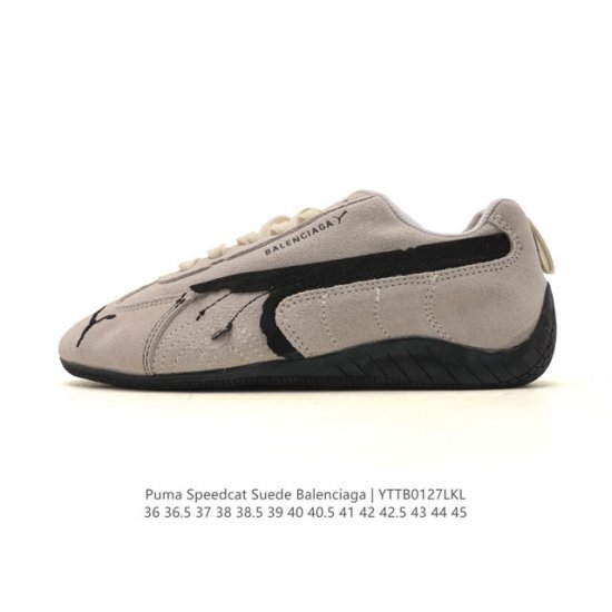 Puma x Balenciaga Speedcat series sneakers, thin-soled, suede, round-toe, distressed, low-top casual shoes. These retro-style running shoes from the Speedcat series are authentic. The lightweight and breathable upper provides comfort and a pleasant wearing experience. The soft lining enhances comfort, and the rubber outsole provides lasting traction. Product Code: 847146 Wsdsd 9010 Sizes: 36-45 (including half sizes) Code: Yttb0127Lkl
