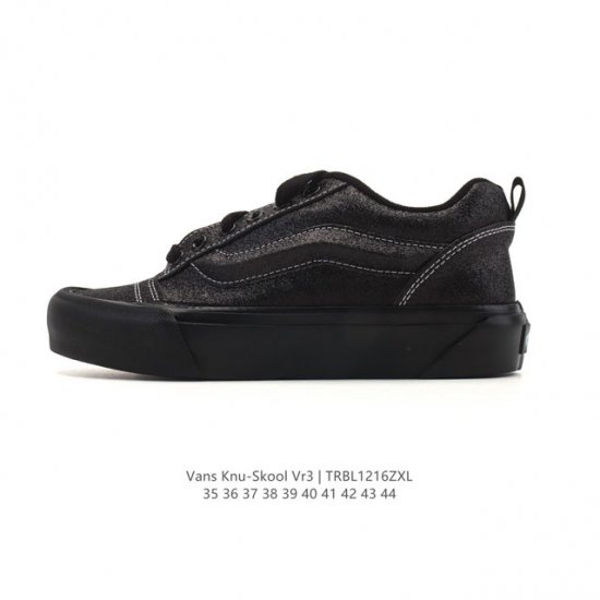 Vans Knu-Skool Vr3 Lx loafers with leather upper. The Campbell's Julian series low-top retro vulcanized casual sneakers with a "fat version and large logo" are definitely among the hottest shoe styles of the year, with almost every brand releasing its own version. Recently, Vans brought back the rarely seen Knu-Skool model, a collaboration with Imranpotato, and released four new colorways. The first colorway features a classic black and white design, with a more oversized and heavy silhouette that aligns with current trends. The upper is wrapped in leather, ensuring excellent texture, and paired with a white midsole, the overall look has a strong OG vibe. Sizes: 35-44 Code: Trbl1216