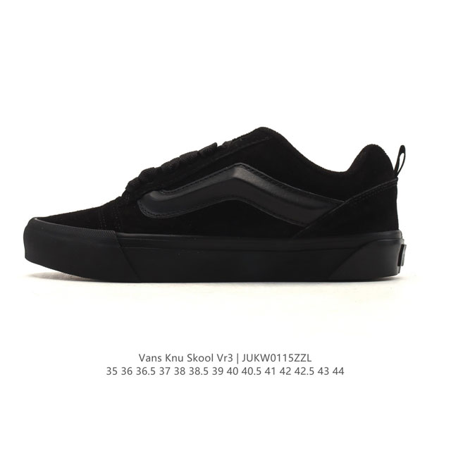 Vans Knu-Skool Vr3 Lx loafers with leather upper. The Campbell's Julian series low-top retro vulcanized casual sneakers with a "fat version and large logo" are definitely among the hottest shoe styles of the year, with almost every brand releasing its own version. Recently, Vans brought back the rarely seen Knu-Skool model, a collaboration with Imranpotato, and released four new colorways. The first colorway features a classic black and white design, with a wider and thicker silhouette that aligns with current trends. The upper is wrapped in leather, ensuring excellent texture, and paired with a white midsole, the overall look has a strong OG vibe. Sizes: 35-44 (including half sizes) Code: Jukw0115Zzl